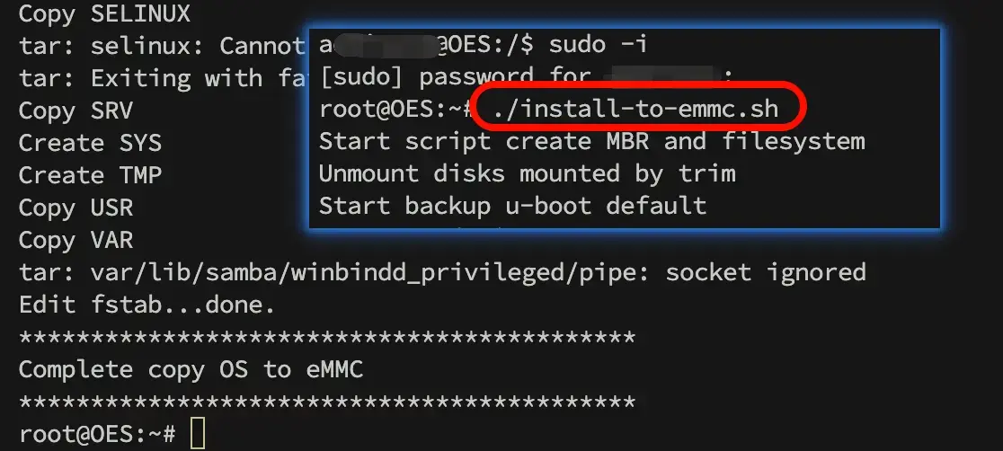 4、第一次好像因为eMMC原本是系统16+13存储空间分区,第一次写入没成功,删除存储空间后重启再次操作非常快速的完成OS写入eMMC的操作。