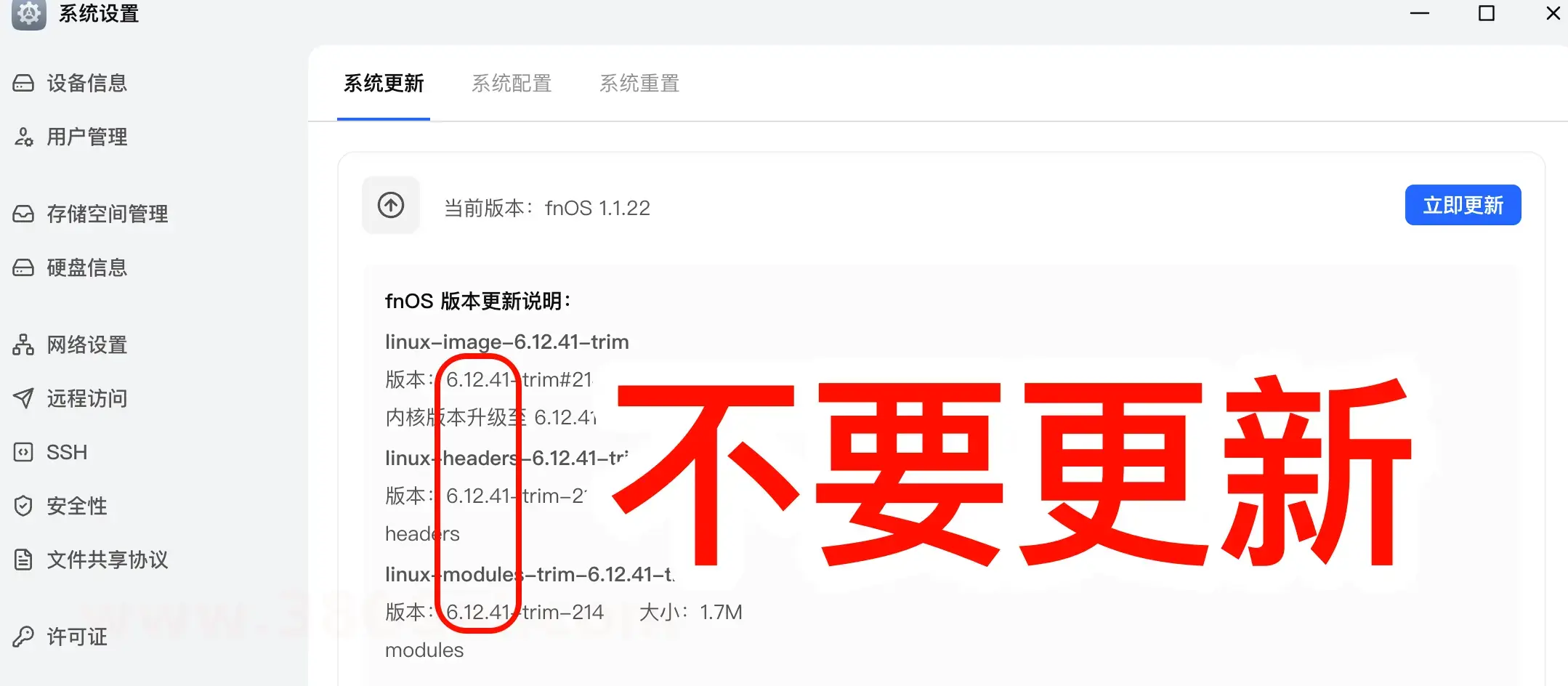 5、进来后,会有更新的提醒,一定不要点“更新”。你现在是6.18的内核,提示的更新是6.12。更新会废掉的。