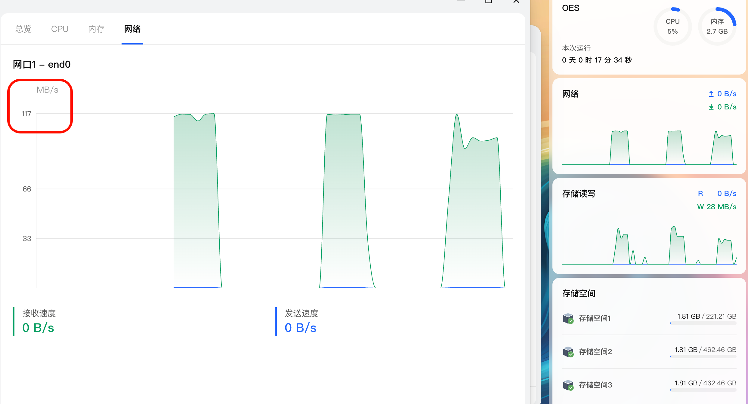 8、依旧给三个硬盘,上传了三个一样的文件,两个2.5寸机械盘跑满117MB/s的千兆局域网。2.5寸的SSD稍逊一筹。