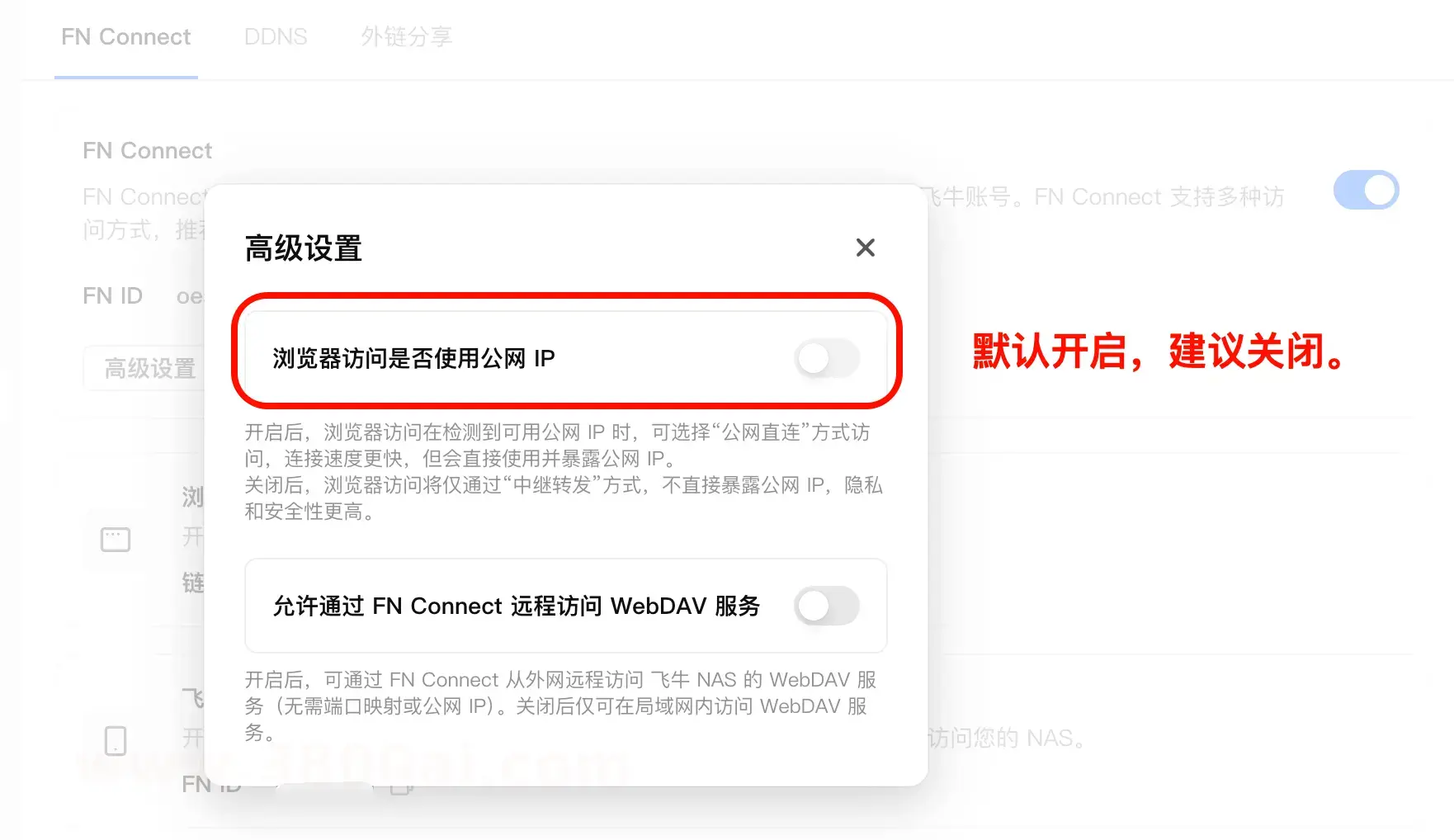 10、Fn ID开启,然后从高级设置里把“浏览器访问是否使用公网IP”关闭,这是我的习惯。因为有时候IPv6不稳时候,我会用Fn ID,但是用Fn ID时候我不喜欢它把IPv6地址给我显示出来。