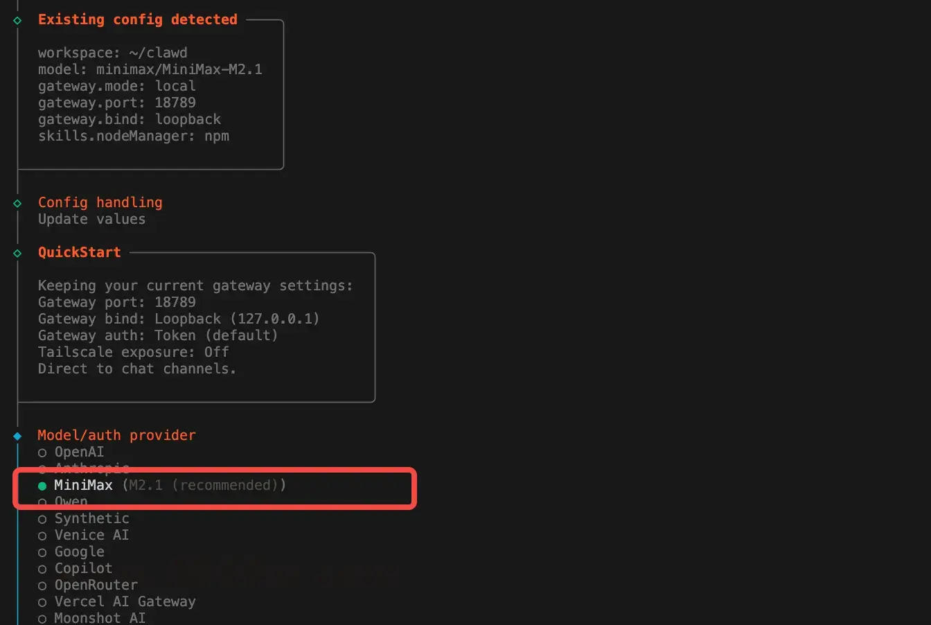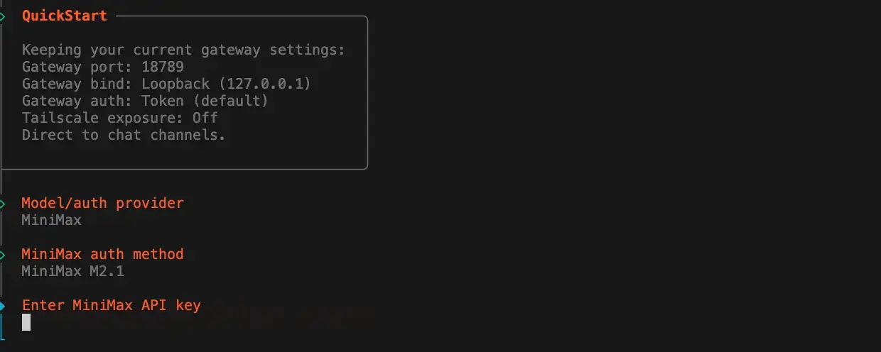 moltbot onboard --install-daemon就会进入引导程序,选择MiniMax作为模型提供商。
