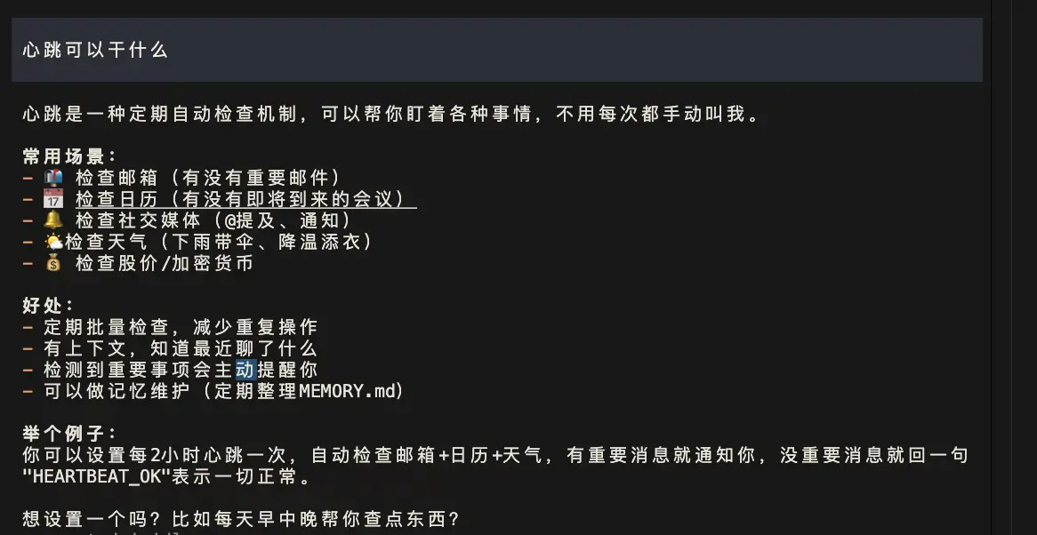 心跳可以同时执行多个任务,比如可以获取新闻、检查邮件等等,都拿自然语言和它说就好了,它都能自动化帮你开始任务。