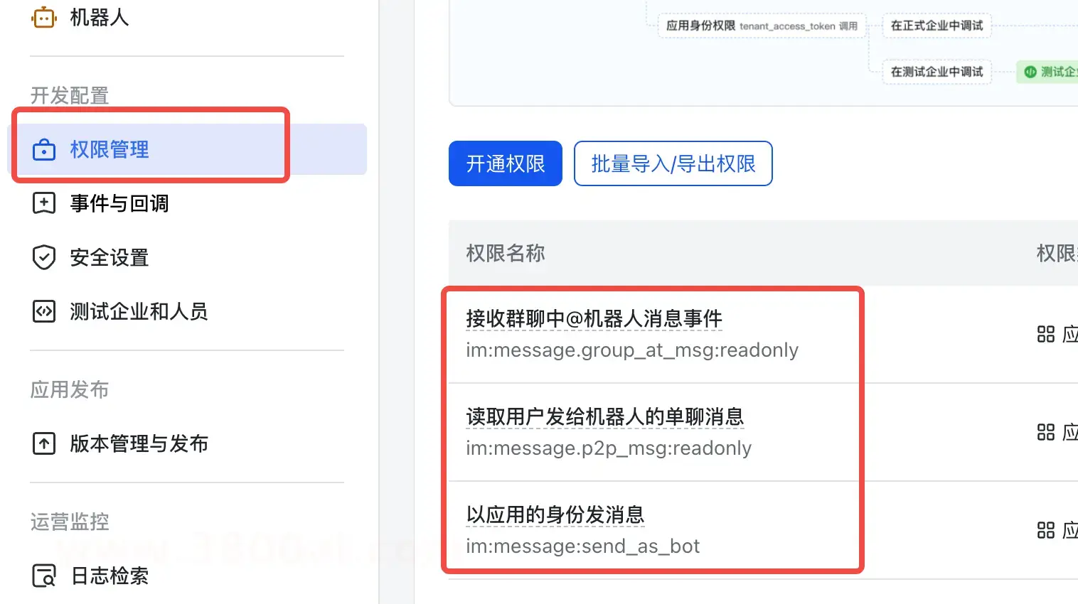 然后左侧有权限设置,我们的机器人需要有这些权限: