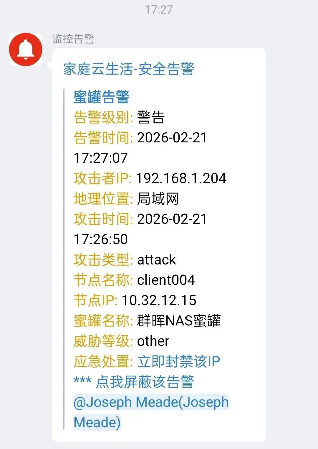 至此,也就完成了飞牛 NAS 接入蜜罐了,一有风吹草动,就能及时收到告警,让内鬼无处遁形!