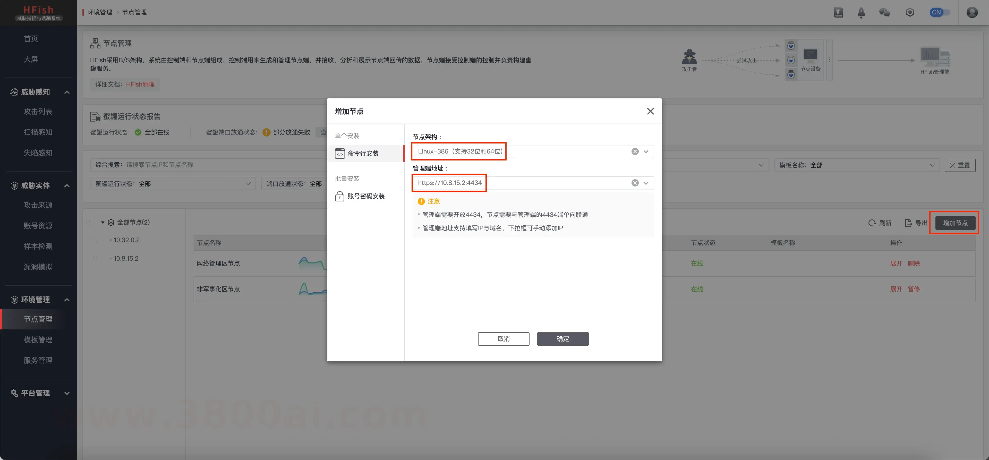 服务端搭建方法往期文章 安全建设:如何给家庭 NAS 搭建一套免费社区型蜜罐 HFish 已有介绍,这里再赘述,这里直接切入飞牛主角。