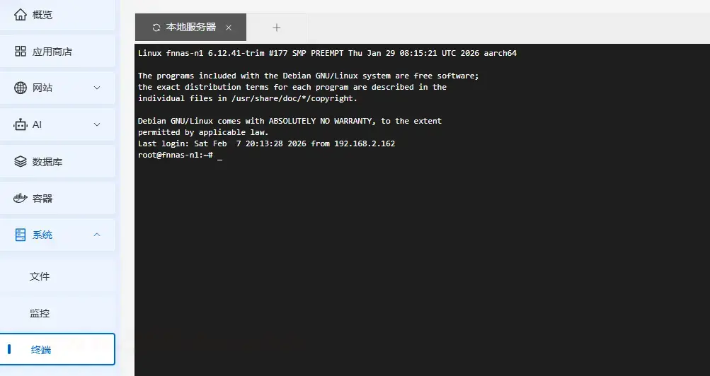 先用这一最后一次 SSH 工具登录你的飞牛 NAS(切换到 root 用户或使用 sudo)。