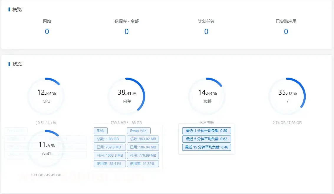 文件管理 监控状态:首页仪表盘清晰展示了系统负载和资源占用。