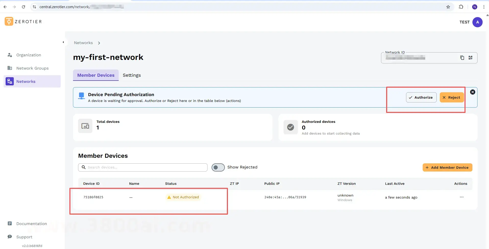 在Zerotier的账户中心查看加入申请,并通过,可以根据设备ID进行甄别。