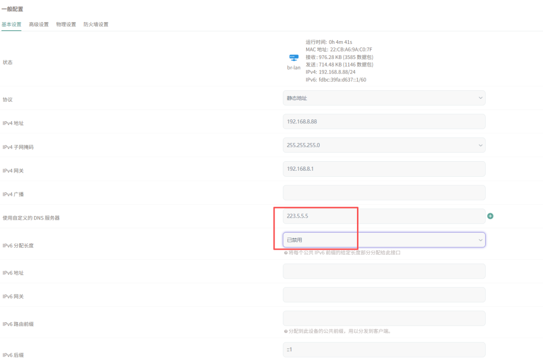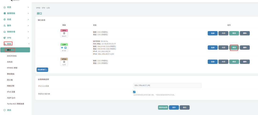 首先点击网络-接口-LAN-修改,修改DNS。推荐223.5.5.5或其他公共DNS,也可填写运营商分配的DNS,建议禁用IPv6。然后点击保存&应用。DNS可酌情添加2个,点击右侧+号即可。