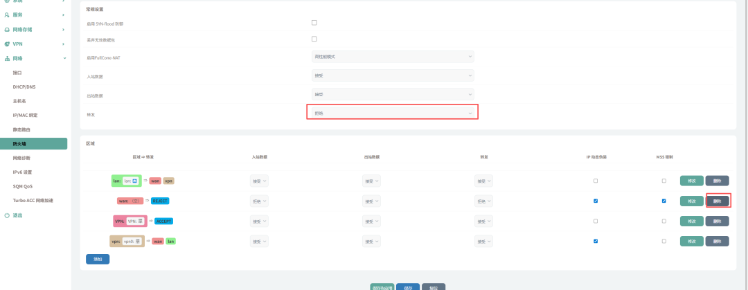 接着到网络-防火墙,把上面三个都改成允许,并删除第二条WAN规则。因为都是旁路由,没有WAN口——当然不删也可,我有强迫症😂