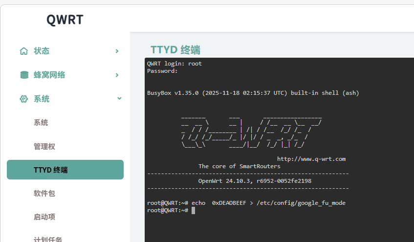 初始化完成,接下来开启神秘插件。在系统中选择TTYD终端,登录账号密码,输入下方代码后回车,刷新页面即可。